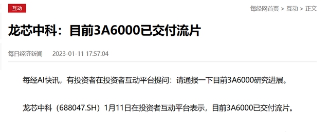 近日,在投資者互動平臺上,有人咨詢關(guān)于3A6000芯片的研究進(jìn)展問題,龍芯中科回復(fù)表示:目前3A6000已交付流片。這說明,國內(nèi)下一代CPU首款芯片,基于自主化設(shè)計,目前已經(jīng)完成了研發(fā)。