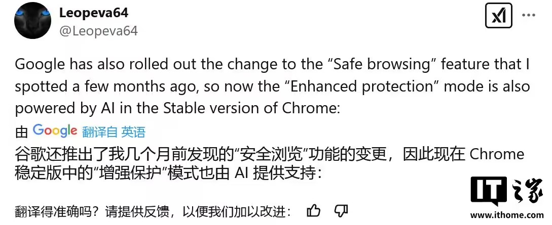 IT之家 2 月 17 日消息,消息源 @Leopeva64 昨日(2 月 16 日)在 X 平臺(tái)發(fā)布推文,稱(chēng)在經(jīng)過(guò) 3 個(gè)月的 Canary 頻道測(cè)試后,谷歌 Chrome 瀏覽器穩(wěn)定版已全平臺(tái)上線全新“增強(qiáng)保護(hù)”(Enhanced protection)功能,在現(xiàn)有功能基礎(chǔ)上,通過(guò) AI 實(shí)時(shí)防護(hù)危險(xiǎn)網(wǎng)站、下載和擴(kuò)展程序等。
